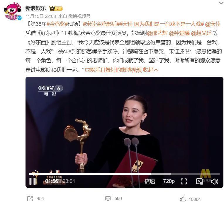 随后,她感谢了导演,感谢了电影中的搭档宋佳。
